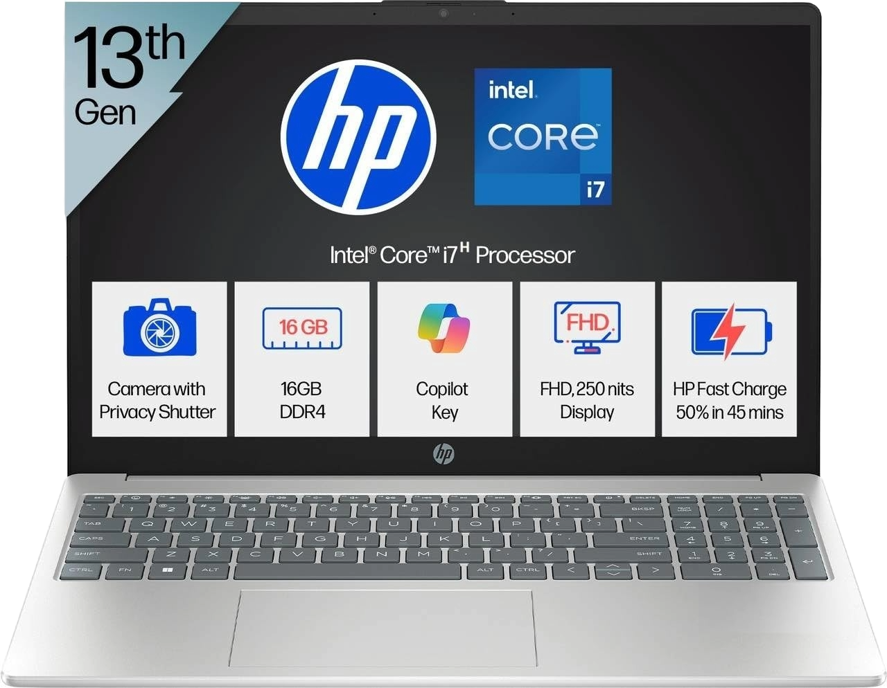 HP 15, Ci7-13620H 13th Gen Laptop (16GB DDR4, 512GB SSD) Anti-Glare, Micro-Edge, 15.6''/39.6cm, FHD, Win11, M365 Basic(1yr), Office Home24, Silver,1.65kg, FHD Camera W P. Shutter, Backlit fr0025TU
